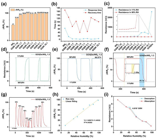 Comparison between the performance of flexible sensors based on pure WS2 and GOQDs/WS2 composite in terms of humidity sensing. (a,b) Responsivity, response time and recovery time across various ratios, (c) values of resistance at 11% and 98% RH, (d) repeatability test of GOQDs/WS2 (1:3), (e) responsivity 99.57%, (f) response time of 1.55 s and recovery time of 4.11 s, (g) stepwise RH sensing, (h) linear correlation between responsivity and RH, and (i) relation between resistance and relative humidity. Reproduced with permission from Ref. [139]. Copyright (2025) American Chemical Society.