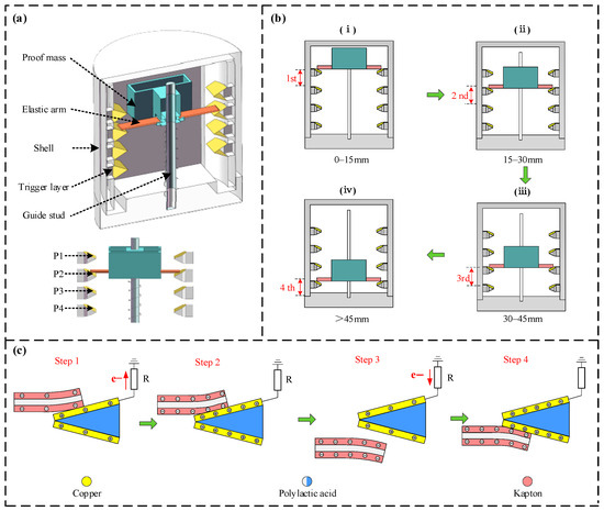 Schematic diagrams of the sensor’s structure, working principle, and operating steps. (a) Schematic diagram of the sensor structure; (b) schematic diagram of the sensor’s working principle. (i) First-level trigger schematic diagram; (ii) Second-level trigger schematic diagram; (iii) Third-level trigger schematic diagram; (iv) Fourth-level trigger schematic diagram; (c) schematic diagram of the principle for triboelectric signal generation.