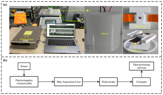 The experiment was conducted using a simulated setup as depicted in Figure 2a. The experimental apparatus consisted of a vibration controller, an electromagnetic shaker, a data acquisition card (DAQ), an electrometer, and a computer. The sensor was affixed to the electromagnetic shaker. By adjusting the parameters via the vibration controller, the amplitude and frequency of the electromagnetic shaker could be precisely controlled. As illustrated in Figure 2b, the sensor’s output data from the sensor was sequentially processed by the DAQ card and the electrometer before being relayed to the computer. This computer was equipped with software developed in LabVIEW (Version 13.0) for the real-time display and storage of sensor data. The subsequent tests were performed to assess the sensor’s sensing characteristics, measurement precision, power generation capabilities, and operational adaptability, as detailed below.