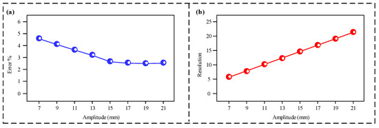 The effect of different interlayer spacings on the sensor’s sensing performance is shown in Figure 3. As shown in Figure 3a, with the interlayer spacing increasing from 7 mm to 15 mm, the sensor’s measurement error rate exhibits a clear downward trend, significantly decreasing from approximately 4.5% to around 2.7%. When the spacing continues to increase from 15 mm to 21 mm, the error rate remains essentially stable, showing no further significant improvement. The resolution results are shown in Figure 3b. The sensor’s measurement resolution shows a linear positive correlation with the interlayer spacing. As the spacing increases from 7 mm to 21 mm, the resolution also increases linearly from 7 mm to 21 mm. Smaller interlayer spacings enable higher measurement resolution, thus allowing for a finer differentiation of vibration amplitudes. To ensure both a low error rate and high resolution, 15 mm is selected as the interlayer spacing for all subsequent experiments.
