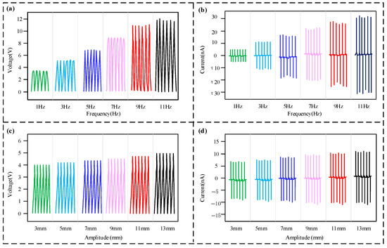 The sensing performance test results of the sensor are shown in Figure 4, testing the sensor’s output characteristics under vibration frequencies from 1 Hz to 11 Hz and vibration amplitudes from 3 mm to 13 mm. Since the triboelectric signals generated by the different layers of the sensor were consistent, the first layer was selected as the test unit. To begin, the amplitude was fixed at 10 mm to test the performance of the sensor under different frequency conditions. Figure 4a,b illustrate that the voltage and current outputs generated by the sensor are both pulse signals, and there is a one-to-one correspondence between the vibration frequency and the number of pulses. When the frequency of vibration was raised from 1 to 11 Hz, the amplitudes of the output voltage and current both showed a distinct upward trend. When the vibration frequency reached 11 Hz, the sensor’s maximum output voltage reached around 11.8 V, while the maximum output current reached approximately 28 nA. When the vibration frequency exceeded 11 Hz, the sensor’s output waveform became irregular, and the one-to-one correspondence between the vibration frequency and the number of pulses was lost. Therefore, the measurement range for the sensor’s vibration frequency is determined to be in the range of 0 to 11 Hz. Subsequently, the performance of the sensor was evaluated at different amplitudes while the vibration frequency was fixed at 1 Hz. As shown in Figure 4c,d, with an increase in vibration amplitude from 3 mm to 13 mm, there was a corresponding steady rise in the sensor’s output voltage and current amplitudes. When the vibration amplitude was 13 mm, the sensor achieved a maximum output voltage of about 5.0 V and a maximum output current of about 11 nA, respectively. The reason for the increased signal amplitude with rising frequency or amplitude is likely that higher frequency and amplitude result in greater acceleration of the vibration shaker. This leads to a stronger impact force upon contact between the sensor’s friction layers, ensuring more complete contact and a larger frictional contact area, which in turn produces a signal with a higher amplitude.