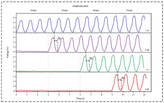 Figure 5 shows the step-wise response characteristics of the sensor when subjected to different vibration amplitudes. To ensure that the selected amplitudes can stably trigger the corresponding level, 10 mm, 25 mm, 40 mm, and 55 mm were selected in sequence. At an amplitude of 10 mm, only the first layer outputs a triboelectric signal. As the amplitude is increased to 25 mm, 40 mm, and 55 mm, the second, third, and fourth sensing layers are sequentially activated to produce stable voltage outputs, and they continue to output signals along with the previously activated layers. Furthermore, with an increase in amplitude, the magnitude of the output voltage signal also shows a progressive increase, reaching 6.1 V at an amplitude of 55 mm. These findings indicate the sensor’s capability to detect distinct amplitude thresholds at 10 mm, 25 mm, 40 mm, and 55 mm.