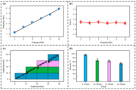 Figure 6c,d show the sensor’s measurement error situation at different amplitude intervals. As shown in Figure 6c, the input amplitude and the sensor’s measured values show a high degree of consistency, with the data points accurately mapped to their corresponding preset tiered intervals. As shown in Figure 6d, in the 0–15 mm interval, the sensor’s measurement accuracy rate is 99.6%. At higher amplitude intervals, the accuracy rates show a slight decrease, but all remain above 97%; therefore, the error in the sensor’s amplitude measurement also remains below 3%.