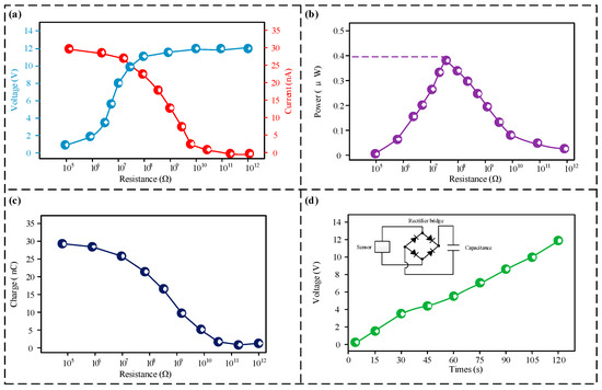 Power generation test results. (a) Output voltage and output current of the sensor under different loads; (b) output power of the sensor under different loads; (c) transfer charge of the sensor under different loads; (d) results of the sensor’s charging performance test.