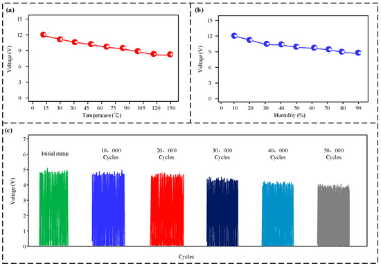 Environmental adaptability test results. (a) Voltage response to varying temperatures; (b) voltage response to varying relative humidities; (c) durability of the sensor’s voltage output across several operating cycles.