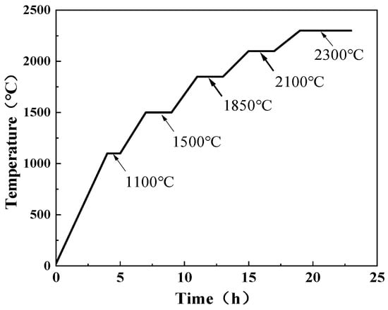 The material used in this study was W-1%La2O3 alloy. Starting with APT (Ammonium Paratungstate) as the raw material, blue tungsten oxide (BTO) was produced via hydrogen reduction. La2O3 was then added and blended with the BTO. Subsequently, the mixture was reduced in a 15-tube reduction furnace to obtain alloyed tungsten powder with a particle size distribution of 2.0–2.5 μm. The powder was then sieved through a 200-mesh screen to remove coarse particles and impurities. The sieved powder was compacted by cold isostatic pressing at 200 MPa for 90 s, followed by sintering in a medium-frequency furnace for 23 h (the heating profile is shown in Figure 1). This process yielded sintered tungsten alloy billets with a diameter of ø23 mm. The tungsten alloy billet was then cogged on a rolling mill. The billet was heated to 1650 °C and held for 30 min prior to rolling. After ten passes, the ø8.9 mm rod was obtained. Subsequently, the tungsten alloy rods were annealed in a hydrogen atmosphere using a high-frequency induction furnace. The annealing temperature ranged from 2000 °C to 2300 °C with a holding time of 10 s. After that, the ø8.9 mm rod underwent two cycles of deformation and annealing to achieve a final diameter of ø5.2 mm. Finally, the ø5.2 mm rod was processed into ø0.8 mm tungsten alloy wire through a series of wire drawing passes.