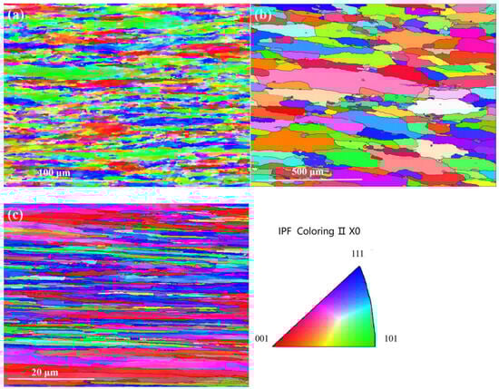 Figure 2. Grain boundaries and orientation of tungsten alloy in different states: (a) ø8.9 mm 85% rolled deformation; (b) ø5.2 mm rod (annealed at 2300 °C) and (c) ø0.8 mm wire.