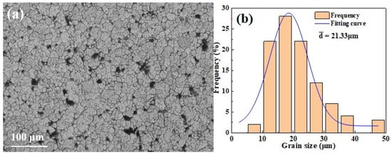 Previous studies indicate that the particles in W-1%La2O3 tungsten alloy contain not only La2O3 but also tungsten oxide and a tungstate containing lanthanum [21]. Figure 3a displays the metallographic microstructure of the cross-section of the ø23 mm tungsten billet. The microstructure exhibits diverse grain morphologies, distinct grain boundaries and a dense structure. Figure 3b illustrates the grain size distribution across the cross-section of tungsten alloy. The grain sizes range from 5 μm to 50 μm, with the majority falling between 10 μm and 30 μm. The average grain size is 21.33 μm. The grain size distribution approximates a normal distribution, indicating a relatively uniform microstructure.