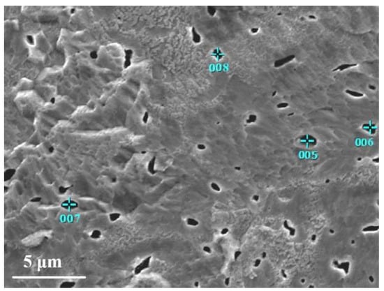 The examination of the microstructure of ø8.9 mm tungsten alloy rods annealed at 1480 °C revealed the presence of white spherical or elliptical particles on the W-La alloy matrix, as shown in Figure 4. To identify their composition, spot EDS analysis was performed on these particles; the results are shown in Table 4. The EDS data show that W and O are the predominant elements, while La content is minimal. This suggests that oxidation occurred during the preparation process, and the white particles are primarily tungsten oxides.