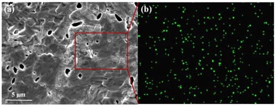 Dark spherical and acicular particles were also observed in the microstructure of the ø8.9 mm tungsten alloy rod annealed at 1480 °C, as shown in Figure 5. Spot EDS analysis was performed on these particles, and the results are shown in Table 5. As seen in Table 5, the content of La element at points 5, 6 and 7 is significantly higher, suggesting that La forms thermally stable La2O3 particles during alloy processing. These dark particles are thus identified as lanthanum oxide particles [22]. Figure 6b shows a generally uniform distribution of lanthanum within the tungsten alloy matrix, although localized clustering is evident. In Figure 6a, numerous dark irregular particles are dispersed both within the tungsten matrix and along the grain boundaries. These oxide particles inhibit grain growth, hinder dislocation motion, and contribute to strengthening via the Orowan mechanism [23,24,25]. Concurrently, grain refinement increases the grain boundary density, leading to significant fine-grain strengthening and an overall improvement in alloy properties [26].