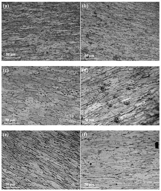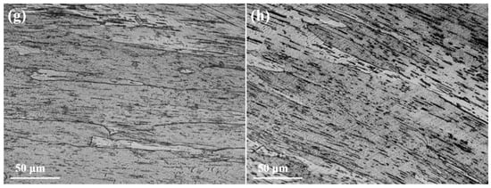 Figure 7 presents the longitudinal section microstructure of tungsten alloy processed under different temperatures and deformation conditions. Comparing microstructures under identical deformation (85% rolling), the fibrous grain morphology in the longitudinal section appears qualitatively similar for both low- and high-annealing temperatures. Figure 7a,b illustrate the longitudinal section microstructure of tungsten alloy rod obtained after 85% rolling deformation. This large deformation results in a fragmented grain structure, with fine grains observed both within and along the boundaries of the original crystals. Quantitative analysis reveals distinct grain size variations with processing temperature under the same deformation: Figure 7c: Average long axis ≈ 95.1 μm, short axis ≈ 18.2 μm (aspect ratio ≈ 5.2); Figure 7d: Average long axis ≈ 78.8 μm, short axis ≈ 11.2 μm (aspect ratio ≈ 7.0); Figure 7e: Average long axis ≈ 154.6 μm, short axis ≈ 14.3 μm (aspect ratio ≈ 10.8); and Figure 7f: Average long axis ≈ 104.2 μm, short axis ≈ 7.8 μm (aspect ratio ≈ 13.4). Therefore, under identical deformation (85% rolling), increasing the processing temperature leads to a decrease in the average dimensions of both the long and short axes of the fibrous grains. However, concurrently, the grain aspect ratio (long axis/short axis) increases significantly. Furthermore, at a constant processing temperature, increasing the deformation level from 34.6% to 65.9% also results in an increase in the aspect ratio of the fibrous grains, making them more elongated. Figure 7g,h depict the microstructure of ø5.2 mm tungsten alloy rod processed at 1330 °C and 1380 °C, respectively, under a higher deformation level of 82.7%. The longitudinal microstructure at both temperatures exhibits elongated grains, but with an increased grain width compared to lower deformation levels. This significant microstructural change, characterized by grain coarsening, indicates the onset of recrystallization and grain growth.