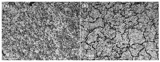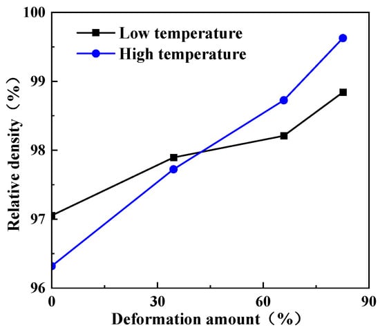 As can be seen from Figure 10, the relative density of tungsten alloy is above 97% at both low temperature and high temperature, and the density of tungsten alloy gradually increases with the increase in deformation. When the deformation increases from 0% to 82.7% at low temperature (1400–1330 °C), the density increases from 18.42 g/cm3 to 18.76 g/cm3, and the relative density increases from 97% to 98.8%. At higher processing temperature (1480–1380 °C), the density increases from 18.48 g/cm3 to 18.81 g/cm3, and the relative density increased from 97.4% to 99.1%, indicating that the material achieves near-theoretical density. The higher density observed at elevated temperatures is attributed to enhanced sintering densification. Elevated temperatures promote grain growth and reduce porosity, particularly at grain boundaries, thereby increasing the material density [28].