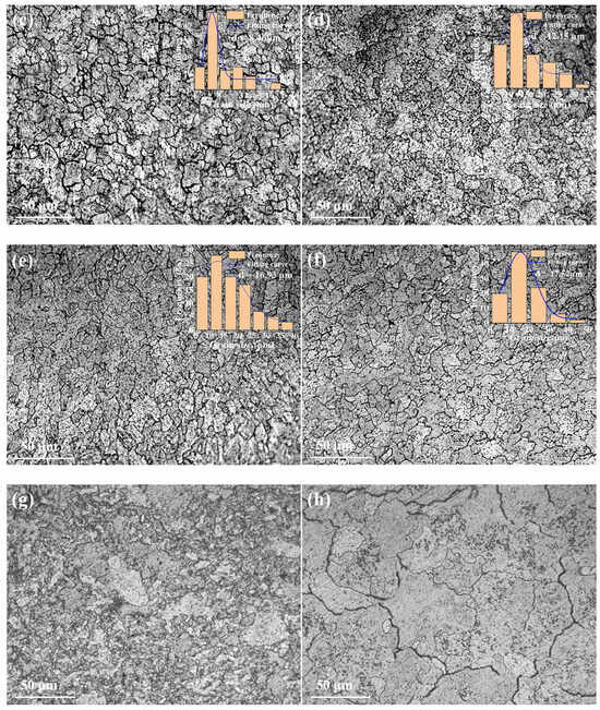 Figure 8 presents the cross-section microstructure of tungsten alloy at different temperatures. Comparing Figure 8a and Figure 8b, cracks are observed in the sample processed at 1480 °C, which also exhibits a lower grain count compared to the sample processed at 1400 °C. This is attributed to excessive processing temperature, which increases the material’s susceptibility to high-temperature brittleness, facilitating crack initiation at grain boundaries. Figure 8c–f show the microscopic morphology and grain size distribution of tungsten alloy samples processed at different temperatures. The corresponding average grain sizes are 8.46 μm, 14.73 μm, 16.29 μm and 17.52 μm, respectively.