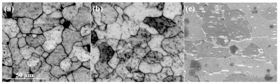 Figure 11 presents cross-sectional microstructure of the ø8.9 mm tungsten alloy rod annealed at different temperatures. After annealing at 2000 °C (Figure 11a), fine subgrains are observed at grain boundaries, indicating incomplete recrystallization as significant grain growth has not occurred. Figure 11b shows that grains gradually coarsen and the fraction of recrystallized grains increases. At an annealing temperature of 2300 °C (Figure 11c), further grain growth occurs, and fine subgrains evolve into new equiaxed grains.