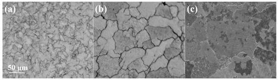 Figure 2 presents the grain boundary maps and the grain orientation distribution of tungsten alloys during different processing states. The high fractions of low-angle grain boundaries (LAGBs) in Figure 2a,c account for 48% and 49%, respectively, which indicates that the internal grains of the alloy are severely deformed and there is a high local dislocation density within the alloy following large deformation. This elevated dislocation density promotes stress concentration, increasing the material’s susceptibility to cracking. In contrast, Figure 2b shows a predominance of high-angle grain boundaries (HAGBs) at 87.5%, accompanied by significant grain growth. This suggests that recrystallization occurred during annealing. This suggests that after annealing treatment, crystal recrystallization occurs, the large angle grain boundaries increase the crystal energy and the original diffuse strengthening effect of the alloy is weakened or disappears, resulting in a reduction in strength [18].