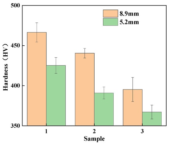 Table 6 lists the hardness, density and relative density of all samples. As shown in Figure 9, the alloy rod processed at lower temperatures (1330 °C to 1400 °C) exhibits a hardness of 522.2 HV. This high hardness is attributed to the substantial work hardening resulting from the large deformation (reducing the diameter from ø23 mm to ø8.9 mm). After annealing during processing at a deformation level of 34.6%, the alloy hardness decreases to 463.8 HV. When the deformation increases from 34.6% to 65.9%, the hardness increases to 498.0 HV. This increase is caused by work hardening due to the elevated dislocation density induced by plastic deformation. Further increasing the deformation to 82.7% raises the hardness significantly to 605.2 HV. This substantial increase results from the combined effects of increased deformation and the associated pronounced work hardening.