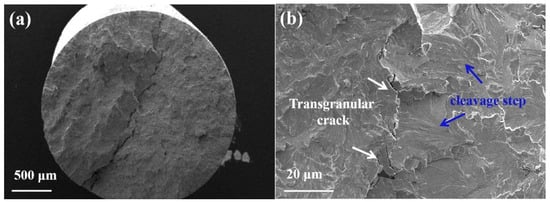 Figure 14 shows the fracture morphology of tungsten alloy wire in the initial state. The fracture of the initial tungsten alloy wire is relatively flat, exhibiting typical brittle fracture characteristics. Cleavage fracture typically features cleavage steps, river pattern and cleavage fan. Figure 14b reveals river-like patterns on the fracture surface, indicating that cleavage fracture occurred during the wire drawing. Additionally, deep cracks are observed in the cross-section, propagating through the grains to form transgranular fracture, as shown in Figure 14b. This is attributed to the severe plastic deformation during drawing, which disrupts the brittle grain boundary cohesion, leading to the formation of transgranular cracks [31].
