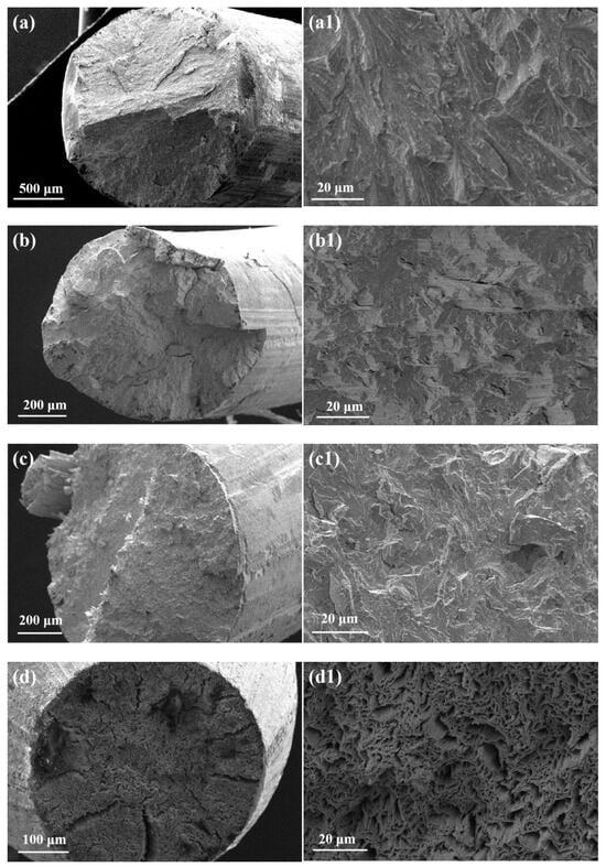 Fracture morphology of tungsten alloy wire under different deformation: (a,a1) 46.4%; (b,b1) 68.4%; (c,c1) 81.2%; (d,d1) 88.4%.