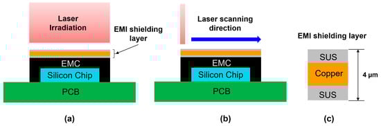 There are two possible laser irradiation methods for peeling the EMI shielding layer. The first method is full-area laser irradiation, as illustrated in Figure 2a. This approach utilizes a homogenized rectangular laser beam, which is commonly employed in laser bonding processes, also known as laser-assisted bonding techniques. The laser with the laser power of 20 W was directly irradiated onto the entire surface of the EMI shielding layer (7 7 mm2) for 1 s. The laser had a wavelength of 1064 nm, and the absorption coefficient of the SUS material at this wavelength was 34% [28]. The second method is the laser scanning method as shown in Figure 2b. In the laser scanning method, a line laser with the beam size of 1 7 mm2 was irradiated onto the EMI shielding layer and moved at a speed of 50 mm/s. The total irradiation time for the laser scanning method was 0.14 s, which is significantly shorter compared to the full-area laser irradiation.