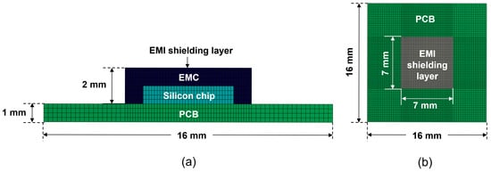 Laser-based peeling of the EMI shielding layer is a relatively simple and intuitive method, well-suited for automation in semiconductor packaging processes. However, the laser may cause damage to the EMC mold material, and further optimization of the process is required. Therefore, prior to the experiment, a detailed numerical analysis was performed. This analysis aimed to assess the feasibility of selectively removing the EMI shielding layer using laser irradiation, determining optimal process parameters—such as laser power, scanning speed, and irradiation duration—and minimizing the risk of damage to the underlying EMC material. Figure 2 illustrates the test vehicle of the package structure, which is a simplified structure of the actual package, designed to evaluate the feasibility of the laser-based peeling process. The package was composed of a silicon chip, EMC material, and a PCB. It was assumed that the EMI shielding layer was deposited on the top surface of the EMC material. The EMI shielding layer had a three-layer structure composed of SUS (stainless steel)–copper–SUS, with the SUS layers each having a thickness of 1 μm and the copper layer 2 μm, resulting in a total thickness of 4 μm. The dimensions of the silicon chip, EMC, and PCB were 5 5 1 mm3, 7 7 2 mm3, and 16 16 1 mm3, respectively.