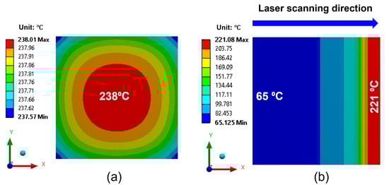 (a) Temperature distribution on the cross-section during laser scanning irradiation. (b) Maximum temperature profile of the package during laser scanning irradiation.