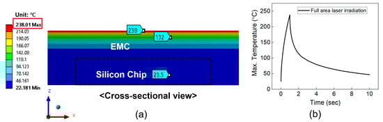(a) Temperature distribution on the cross-section during full-area laser irradiation. (b) Maximum temperature profile of the package during full-area laser irradiation.