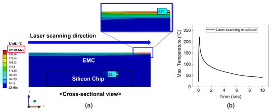 Figure 5 illustrates the temperature distribution on the cross-section of package structure. In the case of full-area irradiation (Figure 5a), the maximum temperature of EMC and the silicon chip was 238 °C and 23 °C, respectively. Figure 5b shows the variation in the maximum temperature of the EMI shielding layer during laser irradiation. The temperature of the EMI shielding layer rapidly increased to 238 °C within 1 s and then quickly dropped to approximately 50 °C. Since the melting point of the EMC material is 270 °C, this temperature rise does not cause melting of the EMC material. Figure 6a,b show the temperature distribution of the package structure and the temperature profile of the EMI shielding layer under the laser scanning method. As shown in Figure 6b, the temperature of the EMI shielding layer sharply increased to 221 °C at the final stage of irradiation (after 0.14 s). The corresponding temperatures of the EMC material and the silicon chip were 221 °C and 22 °C, respectively. Therefore, neither of the laser irradiation methods caused melting of the EMC material or damage to the silicon chip. Notably, in the case of laser scanning irradiation, the high temperature was concentrated in a small, localized region, which can lead to local deformation. This localized deformation is expected to promote easier delamination of the EMI shielding layer compared to full-area laser irradiation.
