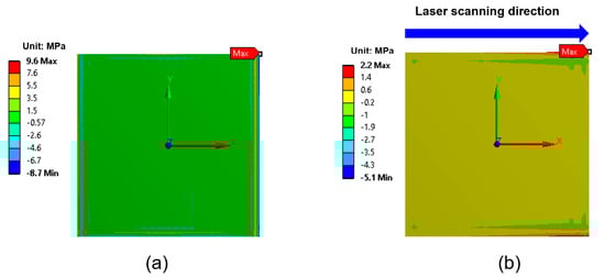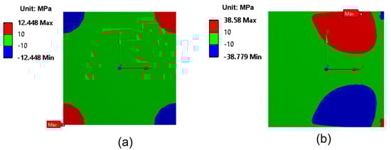 Figure 7 illustrates the distribution of shear stress (τxy) at the interface for two different laser irradiation techniques: full-area irradiation and laser scanning irradiation. The maximum shear stress was located at the corners of the EMI shielding layer, as indicated by the red and blue regions in Figure 7. Notably, the shear stress generated using the laser scanning method is significantly higher than that generated using the full-area irradiation method. In particular, the maximum shear stress in the case of laser scanning reaches 38.6 MPa, nearly three times higher than that observed in the case of full-area irradiation (12.5 MPa), despite the peak temperature during laser scanning being 17 °C lower. This is attributed to the localized heating effect during laser scanning, which induces concentrated thermal gradients and local deformation, resulting in significantly higher shear stress at the interface.