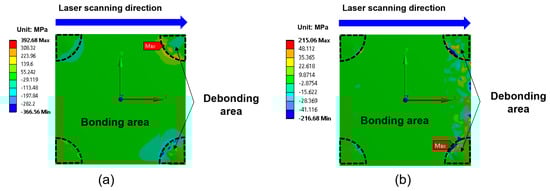 In addition to shear stress, the tensile stress acting normal to the EMI shielding layer and EMC interface—commonly referred to as the peeling stress (σz)—is also a critical factor influencing interfacial delamination behavior. As shown in Figure 8, the maximum peeling stress was observed at the corners of the package. The calculated maximum peeling stresses were 9.6 MPa for full-area laser irradiation and 2.2 MPa for laser scanning irradiation, both significantly lower than the corresponding shear stresses. This is attributed to the fact that thermal expansion during laser irradiation occurred primarily in the horizontal (XY, in-plane) direction rather than in the vertical (Z, out-of-plane) direction, indicating that shear stress is the primary driving force for delamination. Based on the stress simulation results, delamination is expected to initiate at the package corners and propagate inward.