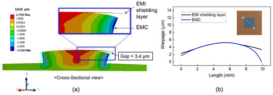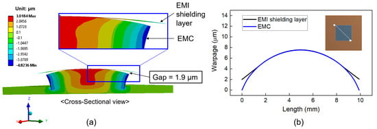 In this section, we investigated the deformation behavior and warpage of the top surface of the EMI shielding layer and the underlying EMC material. The simulation assumed that delamination of the EMI shielding layer initiates at the corners during laser irradiation, leading to partial debonding in those areas. As the temperature of the EMI shielding layer increases, the delaminated regions are expected to propagate inward. In the simulation model, regions without delamination were defined as having bonded contact with the EMC material, whereas the delaminated regions were modeled using a frictional contact condition with a friction coefficient of 0.2. Figure 10a shows a cross-sectional view of the deformation behavior of the EMI shielding layer and package structure during full-area laser irradiation. The EMI shielding layer and the package were deformed in a convex shape (︵). Figure 10b displays the warpage calculated on the diagonal direction of the EMI shielding layer and the top surface of the EMC material. The warpage of the EMC surface was 7.5 μm, while that of the EMI shielding layer was 5.6 μm. The resulting warpage difference between EMI shielding layer and EMC material was 1.9 μm, as indicated by the gap shown in Figure 10a.