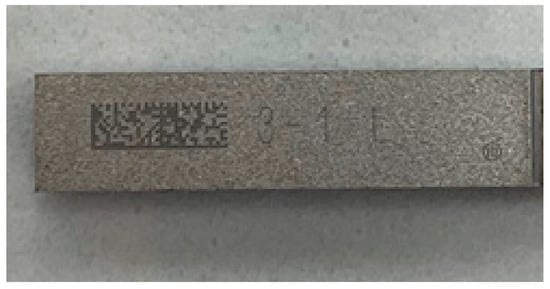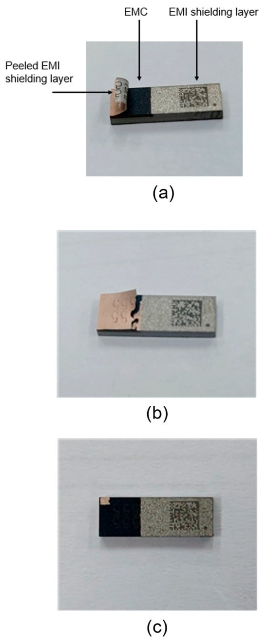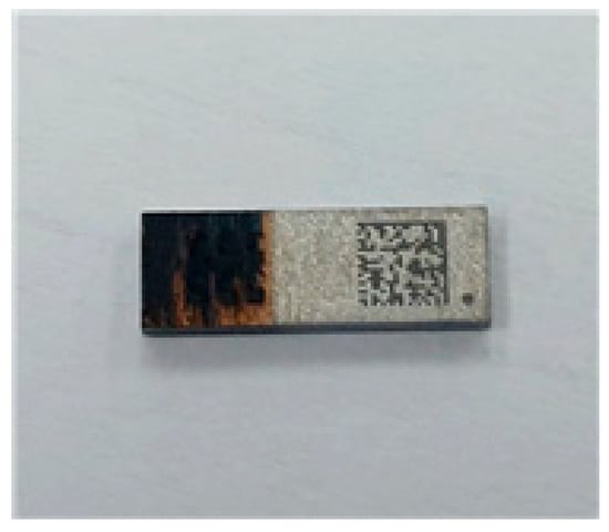 Following the numerical analysis, selective peeling tests for the EMI shielding layer using a laser were conducted. Figure 12 shows a photographic image of the semiconductor package used in the experiment. The package was coated with the EMI shielding layer on the EMC material. The size of the package was 4 × 20 mm2. The EMI shielding layer consisted of a multilayer structure of SUS–Cu–SUS, with SUS and Cu having a thickness of 1 μm and 2 μm, respectively—matching the dimensions used in the numerical analysis. Based on the numerical simulation results, the laser scanning irradiation method was found to be more effective for peeling off the EMI shielding layer compared to full-area laser irradiation. Therefore, only the laser scanning method was employed in the experimental tests. A nanosecond pulsed fiber laser (IPG Photonics, Oxford, MA, USA) with a line beam was used in the experiment. The width of the laser line beam was 25 μm, and the wavelength was 1064 nm. In the numerical simulation, a laser power of 20 W and a line beam width of 1 mm were used. However, the laser beam width was much narrower (25 μm) in the experiment. Therefore, to maintain the same heat flux under experimental conditions using a narrower 25 μm beam, the laser power was proportionally reduced to a range between 4 W and 8 W, as determined through heat flux calculations.