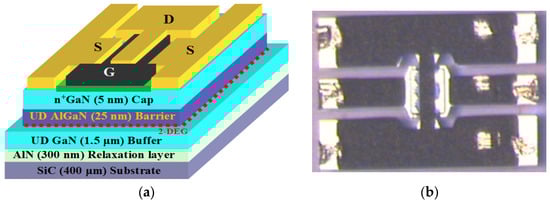 (a) Cross-section view of AlGaN/GaN/SiC HEMT structure (not to scale); (b) optical micrographs [36].