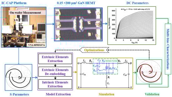Four main steps comprise the device characterization process as illustrated in Figure 2: (1) S-parameter acquisition, (2) cold pinch-off technique, (3) de-embedding, and (4) ADS simulation flow. First, an HP8510C Vector Network Analyzer (VNA), with the aid of an HP4142B DC source, supplied the required current, connected via Ground-Signal-Ground (GSG) radio frequency probes that spanned 45 MHz to 50 GHz, to measure S-parameters. Multiple biasing conditions (Vgs from −6 V to –3 V and Vds from 3 V to 15 V) were used for the measurements, and IC-CAP software 2022 was employed to automate data acquisition and ensure accuracy. In the second step, extrinsic parasitic components like inductances (Lg, Ld, Ls), resistances (Rg, Rs, Rd), and pad capacitances (Cpg, Cpd) could be accurately extracted by suppressing intrinsic device activity using the cold pinch-off technique with Vgs = −10 V and Vds = 0 V. Third, by gradually modifying and eliminating capacitance values (Cpg and Cpd), a de-embedding procedure was carried out to eradicate parasitic effects, especially the PDRZ effect, until the frequency-dependent anomalies in Re (Zij) were removed. Inductive and resistive parameters were also extracted using OFF-state bias data (Vgs = 0 V, Vds = 0 V). A comprehensive small-signal equivalent circuit model was then constructed by importing the cleaned and bias-dependent S-parameter data into the Advanced Design System (ADS). Both extrinsic and intrinsic components (gm, Cgs, Cgd, Cds, Rgs, Rgd, and Rds) were included in this model, which was validated through simulations under all tested frequencies and bias conditions.
