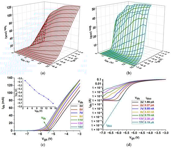 As the Vgs rose from −6 V to −3 V, the Rds values usually showed a decreasing trend, as shown in Figure 7c. Rds was relatively high at lower Vgs values (roughly −6 V), indicating that the device was less conductive. Rds dramatically decreased as Vgs increased, particularly between −5.4 V and −4.8 V, suggesting that the device has better conductivity at higher gate voltages. The overall pattern indicates that higher Vgs values result in lower Rds, underscoring the influence of gate control on the device’s conductivity. In addition, the Rds values vary with Vds.