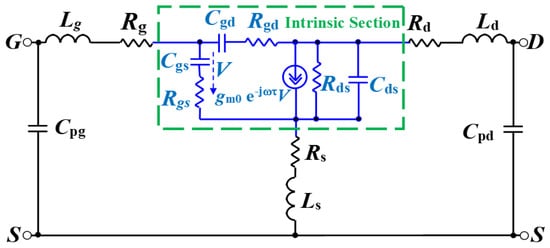 The beneficial properties of GaN HEMTs have made them a focal point in the semiconductor industry. Due to their high breakdown voltage, high electron mobility, and high thermal conductivity, they are suitable for high-power and high-frequency applications [1,2,3,4]. Compared to conventional silicon and GaAs devices, GaN HEMTs that utilize silicon carbide (SiC) substrates offer even greater benefits. SiC’s exceptional thermal conductivity enhances the efficiency and power density of various systems, including radar systems and RF amplifiers, by effectively dissipating heat during high-power operation [5,6,7,8,9,10]. Despite numerous studies examining the DC and RF performance characteristics of GaN HEMTs [11,12,13,14,15,16,17,18,19,20,21,22,23,24], there is limited information available regarding their behavior under varying bias conditions, especially concerning small-signal and multi-bias performance [25,26,27,28,29,30]. To design and analyze GaN RF circuits, it is essential to investigate how multi-bias conditions influence crucial parameters, including transconductance (gm), output resistance (Rds), and intrinsic capacitances. Existing literature has primarily focused on basic DC characteristics under static bias conditions, with earlier work addressing only the influence of bias on switching ability and efficiency. Prior research has focused on the effects of passive and active parasitics, leaving the dynamic impact of bias on RF and small-signal parameters less studied. For example, some research has examined the effects of parasitic components on frequency response and stability [31,32,33], while other research has focused on bias-related noise performance [14,34,35]. However, there has not been a thorough examination of DC, RF, and small-signal characteristics under various bias conditions. The objective of this research is to investigate the behavior of a GaN HEMT 150 with a 150 nm gate length, built on a SiC substrate, and to highlight the impact of bias conditions on equivalent circuit components and high-frequency performance.