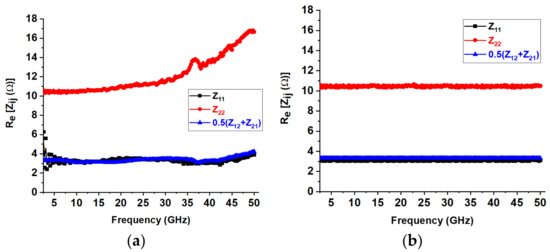 Re (Zij) against frequency under zero bias condition: (a) before and (b) after de-embedding of the extrinsic capacitances.