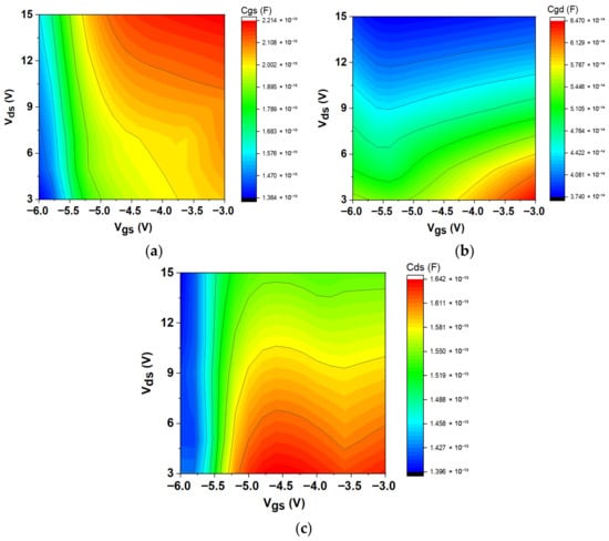 Variation in intrinsic capacitances plotted at different Vds and Vgs for the AlGaN/GaN/SiC HEMT: (a) Cgs, (b) Cgd, and (c) Cds.