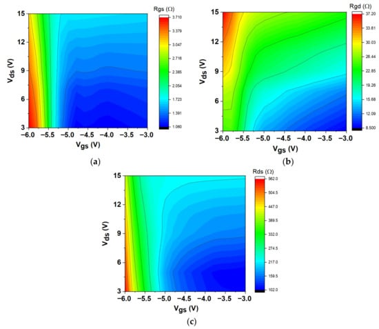 Variation in intrinsic resistances plotted at different Vds and Vgs: (a) Rgs, (b) Rgd, and (c) Rds.