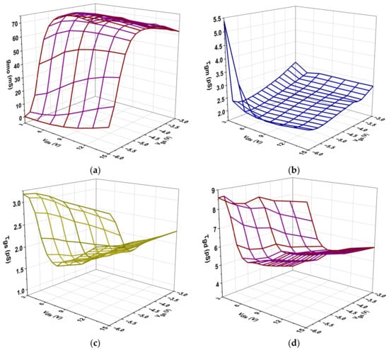 Figure 8 illustrates the intrinsic transconductance (gmo) alongside three intrinsic time constants (τgm, τgs, and τgd). The time constants arise from the transistor’s inherent delay in reacting to rapid signal variations and represent the intrinsic non-quasi-static (NQS) effects that become increasingly pronounced at elevated frequencies. As Vgs transitioned from −6 V to −3 V, gmo typically rose across all Vds levels, signifying improved conductivity and the creation of channels within the transistor. The gmo values were noticeably low at Vgs = −6 V, suggesting that there was insufficient gate voltage for strong channel formation. On the other hand, gmo attained significantly greater values at Vgs = −3 V, peaking at roughly 0.071 mS at Vds = 11 V, suggesting adequate amplification. The data indicate that as Vds increases, gmo tends to stabilize, signifying that the transistor entered the saturation region where further increases in Vds have a decreasing impact on gmo. The time delay τgm in a transistor circuit indicates that as Vgs becomes less negative, τgm typically decreases. This means that charge carriers can move around more easily and respond faster. The time delay increased when Vgs was lower, such as when it was close to −6 V, because the conductivity was insufficient. On the other hand, values close to −3 V showed minimal delay, which is perfect for quick switching.