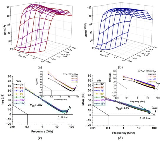 Even in the presence of parasitic effects, Figure 9 demonstrates that the measured h21 and MAG exhibited ideal behaviour, declining with frequency at a rate of −20 dB/decade. The ft and fmax obtained from the data are displayed in the inset images in Figure 9c,d, which show an inversion at various Vds values. When Vds was higher and Vgs was less negative, the cutoff frequency (Figure 9a) typically increased, indicating improved device performance. The range of values was approximately 1.18 × 108 Hz to 5.16 × 1010 Hz. Better device performance under these bias conditions was indicated by the fmax (Figure 9b), which normally increases with increasing Vds and decreasing negative Vgs. The range of the fmax values was approximately 5.23 × 108 Hz to 9.96 × 1010 Hz. The transistor’s suitability for high-frequency applications, such as RF amplifiers and high-speed switching, is demonstrated by both ft and fmax [48].