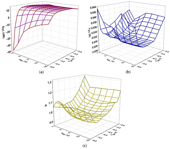 In Figure 10, the impact of biasing on the real part of Y21, the magnitude of S21, and the stability factor K, is illustrated. It is essential to note that the low-frequency values of both Y21 and S21 are specifically correlated with the intrinsic transconductance gmo, as depicted below [49]: