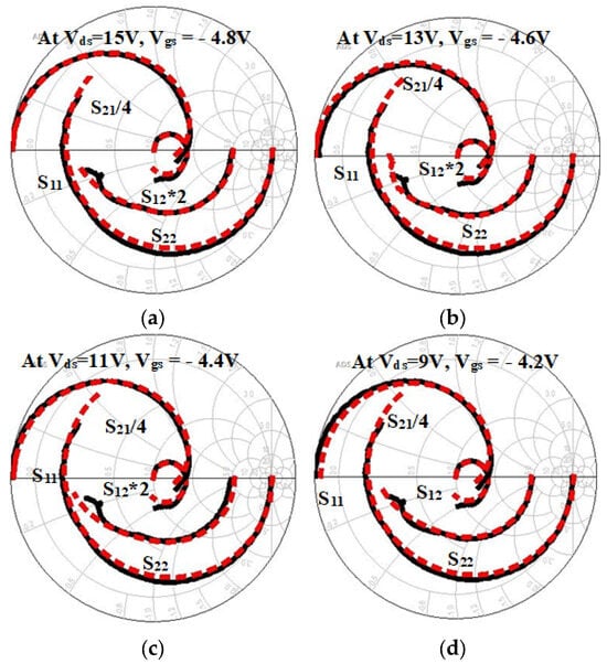 Verification of experimental (black) and modeled (red) data: (a) at Vds = 15 V, Vgs = −4.8 V, (b) at Vds = 13 V, Vgs = −4.6 V, (c) at Vds = 11 V, Vgs = −4.4 V, and (d) at Vds = 9 V, Vgs = −4.2 V.