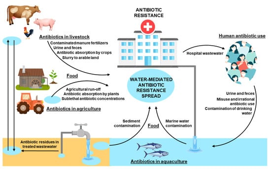 Figure 1. Water as one of the main global transmission routes of antibiotic resistance. Scheme representing the transmission of antibiotic resistance between livestock, agriculture, aquaculture and humans.
