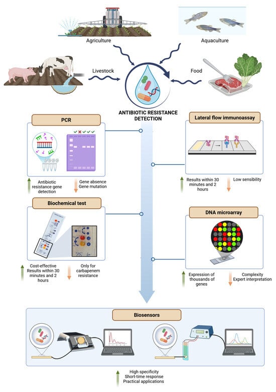Figure 2. Summary of the main analytical tools used in aqueous environments closely related to raw food materials and the finished food product to detect the presence of antibiotic resistance. Water in livestock farming, agriculture, aquaculture, and food matrices can act as a carrier of antibiotics, resistant bacteria, and antibiotic resistance genes. These contaminants are identified using various analytical techniques, including PCR, lateral flow immunoassays, biochemical tests, DNA microarrays, and biosensors. PCR provides information on the presence of resistance genes but cannot detect gene absence or mutations. Lateral flow immunoassays deliver rapid results (30 min to 2 h) but are limited by low sensitivity. Biochemical tests are cost-effective and provide fast results (30 min to 2 h), yet they are typically limited to specific resistances (e.g., carbapenem resistance). DNA microarrays offer broad detection of thousands of genes; however, the method is complex and requires trained personnel. Biosensors represent the most promising tool, combining high specificity, rapid response time, and practical applicability. Advantages and disadvantages of each method are indicated with green and orange arrows, respectively.