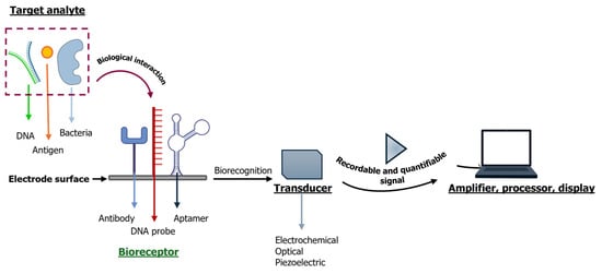 Figure 3. General biosensor components. The target analyte (such as DNAs, antigens, bacteria) binds with the biological recognition element (bioreceptor, such as antibodies, DNA probes and aptamers), generating a biological interaction. Then the electrochemical, optical or piezoelectric transducer converts the signal into a recordable and quantifiable signal. The signal is amplified, processed and displayed on a computer monitor.
