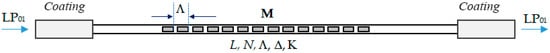 As the mode propagates along the grating periodically, a fraction of its power is coupled to the higher-order LP0p cladding mode. At the output of the grating, we have both modes with different amplitudes. The grating is described by a matrix M, which transforms the input vector of the mode electric fields into an output vector as [2]: