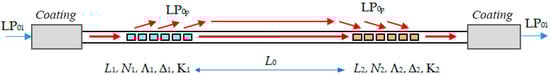 A cascaded LPG (C LPG) consists of (at least) two gratings, LPG1 and LPG2, separated by a fiber section of length L0, whose transmission matrix is T0 (Figure 2) and describes the parallel independent propagation of the LP01 and LP0p modes [7,9]: