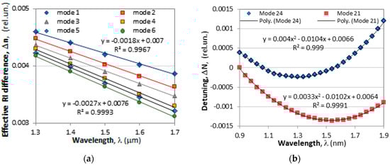 Effects of dispersion and the corresponding fits: (a) linear dependence of the effective refractive difference Δneff between the fundamental HE11 and six higher-order HE1m modes on the wavelength [3]; (b) non-linear spectral dependence exhibiting a minimum of the detuning ΔN between the fundamental guided and two higher-order cladding modes [19].