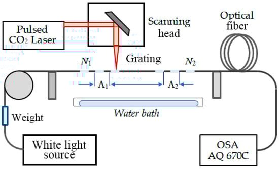 The DR LPGs and the cascaded DR LPGs were fabricated using a pulsed CO2 laser (SYNRAD FHFL30-U) using the experimental arrangement presented schematically in Figure 4. The optical fiber was a photosensitive fiber PS1250/1500 (Fibercore) with a 9.6 μm fundamental mode field diameter. The C DR LPGs consisted of two parts with the same number of periods N1 = N2, the same period Λ = 207.6 μm and effective refractive indices Δneff,i (i = 1, 2). The DR LPGs were labeled as P xxx, implying the fiber is photosensitive, while the C DR LPGs as CP xxx, implying that the DR LPG is cascaded and written in a photosensitive fiber. The laser power expressed as a percentage of the maximum power sufficient to write the gratings, Pmax = 30 W, was in the range between 13.1% and 14.4%. The scanning speed was 24 cm/s. Theoretically, the uncertainty in the total length is about 10 μm, which is determined by the laser marking software. This ensures a precision better than 0.1 μm in the period of the gratings. A K- broadband light source was used to observe the spectrum in the 400 nm to 1700 nm range of the OSA (AQ 6370C).
