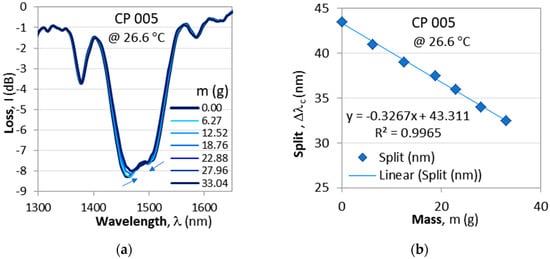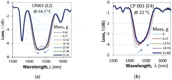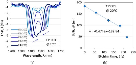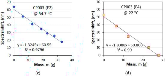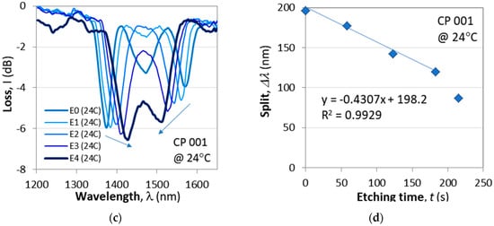 In Section 4.1.2, we showed that accurate fine-tuning to the TAP can be achieved by using additional weights to increase the strain along the grating. The sensitivity to strain, however, depends on the etching stage and the TAP temperature. Figure 16 presents the shrinking spectra of grating CP 003 after second (E2) and fourth (E4) etching. After E2, the split occurs around 55 °C, while after E4, the cascaded grating splits at around 22 °C. As is seen from Figure 16c,d, the sensitivities are different, and after E4, it is higher Sm = −1.8388 nm/g.